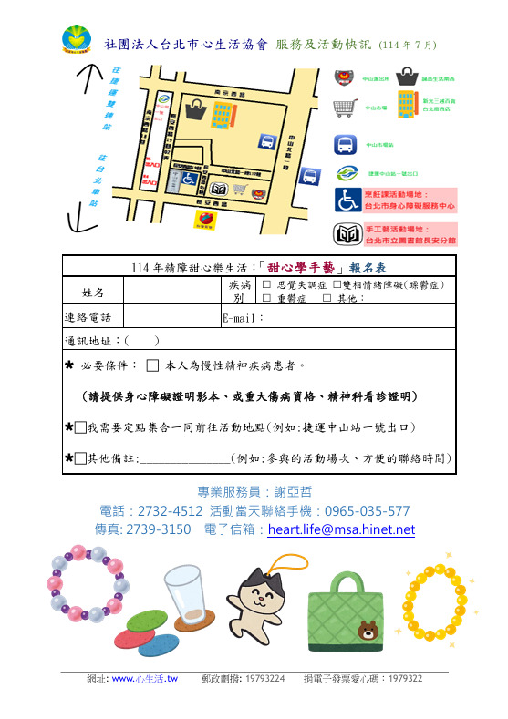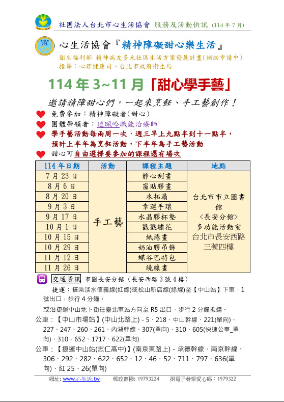 114年下半年精障甜心【甜心學手藝】兩週一次,週三上午九點半,台北市立圖書館<長安分館>多功能活動室(台北市長安西路3號4樓) ~~~114年度下半年《甜心學手藝》帶狀活動進行中,歡迎來電諮詢~~~ 精神障礙者免費參加、可自由選擇要加的課程與場次 專業服務員:謝亞哲 電話:2732-4512 當日連絡電話:0965-035-577 114.Q1樂生活-下半年甜心學手藝-DM 檔案下載 回列表