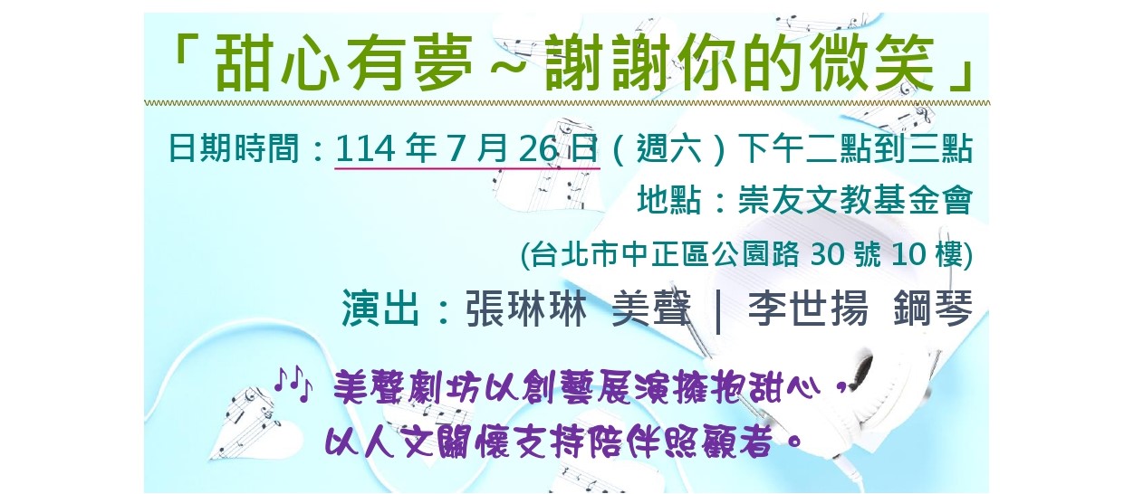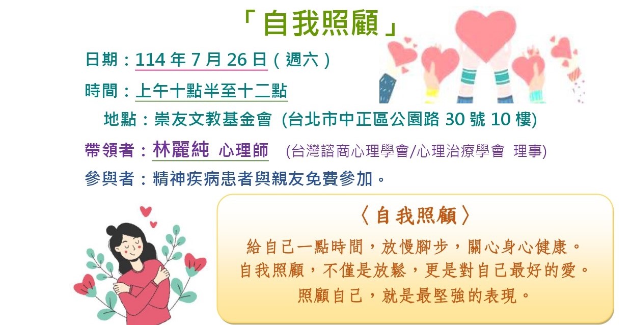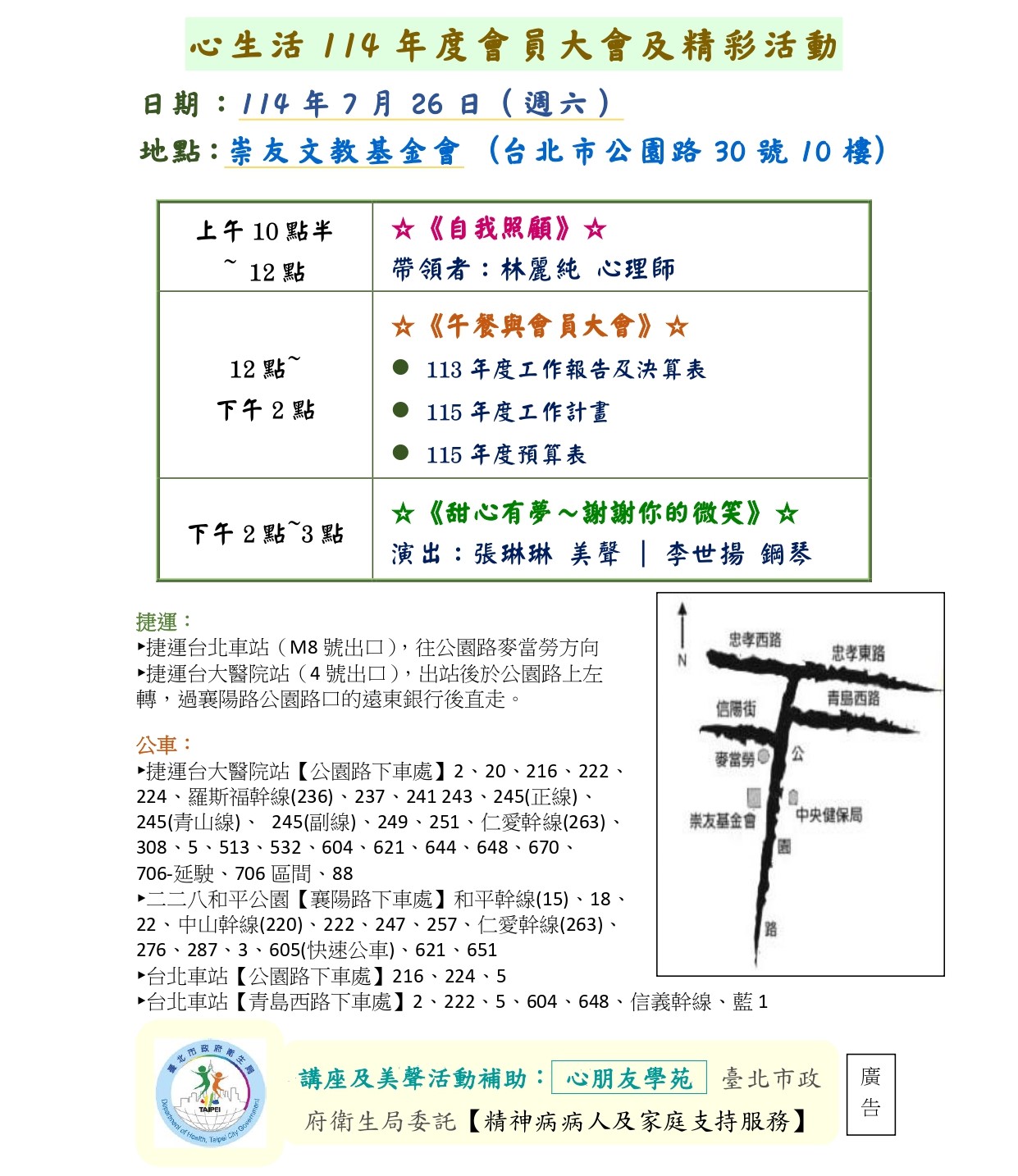 114.7.26 心生活會員大會及精彩活動 ~~會員大會及精彩活動~~ 上午場:10:30至12:00「自我照顧」講座 下午場:14:00至15:00「甜心有夢~謝謝你的微笑」 地點:崇友文教基金會(台北市公園路30號10樓) 歡迎大家一起來參加喔~ 報名專線:2732-8631 回列表