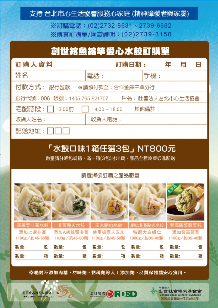 冷凍水餃 (創世基金會提供,龍信食品製作,冷凍宅配到府) 【產品型號】 0000000200 【簡 述】 由創世基金會連結提供的資源,由心生活協會販售冷凍水餃。每次最少採購一箱=三包,五種口味任選。需預付貨款、寫訂購單給我們,收款下單後約七到十天可以到貨。 【售 價】 800 【特 價】 800